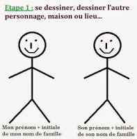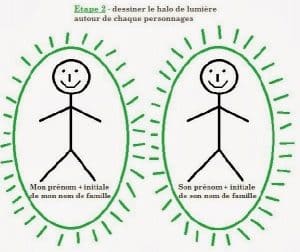 Etape 1 : se dessiner soi-même et à côté, soit la personne concernée, ou bien soi-même à nouveau (pour délier une situation personnelle) ou bien un lieu, une maison, un animal…. On marque au dessous de chaque personnage le prénom et l’initiale du nom.